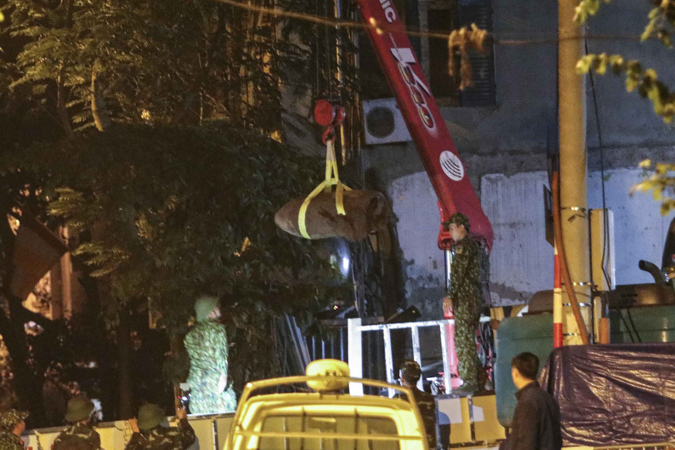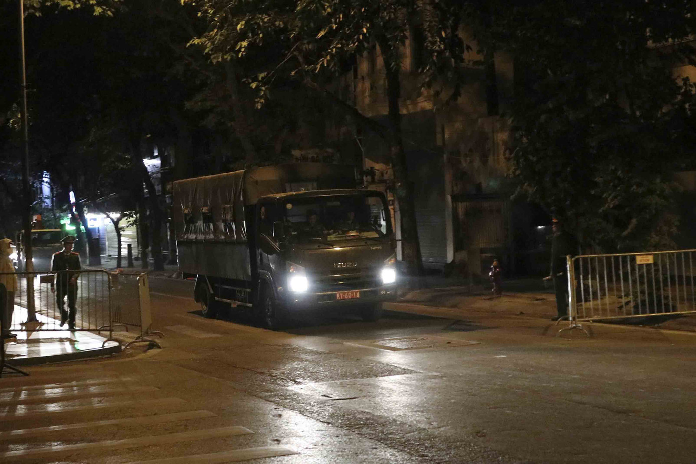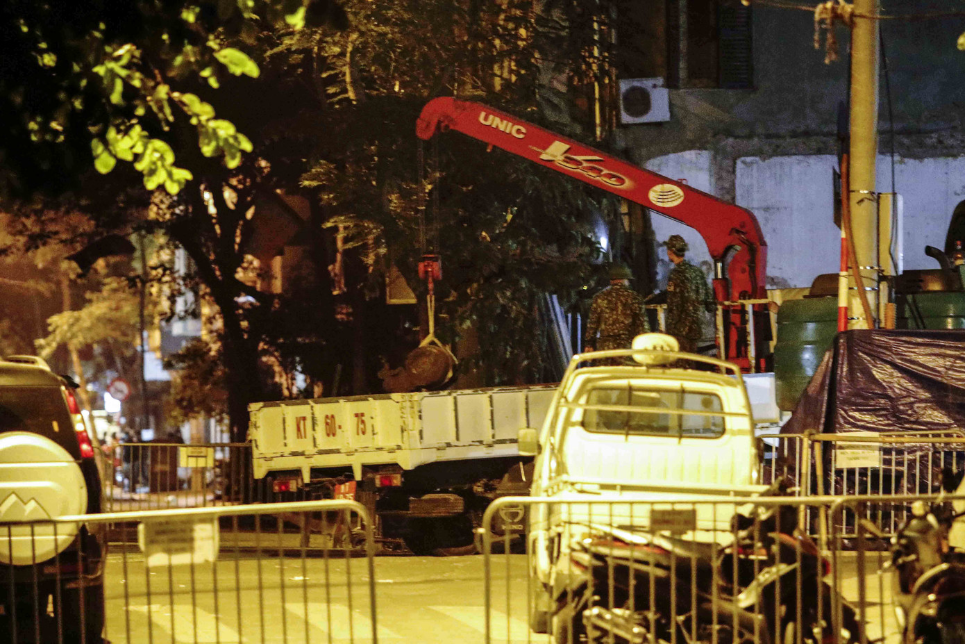 23h30, chiếc xe cẩu tiếp cận hiện trường quả bom tại phố Cửa Bắc (phường Trúc Bạch, quận Ba Đình, Hà Nội).