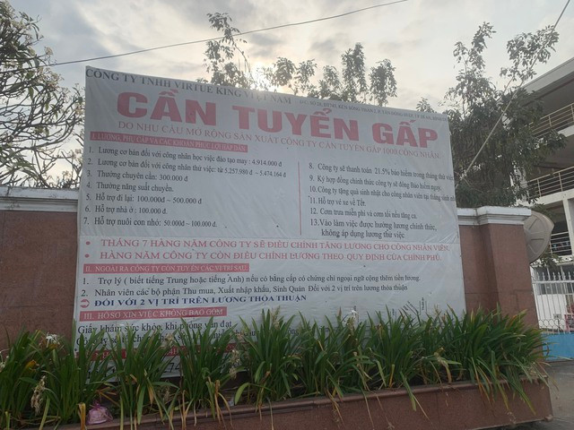 Dạo quanh các KCN, chúng tôi bắt gặp những tấm biển tuyển dụng rất to đặt ngay vị trí mặt tiền của nhiều doanh nghiệp, như tại Công ty TNHH Virtue King Việt Nam (TP Dĩ An), để đáp ứng đơn hàng, công ty thông báo cần tuyển gấp 1.000 lao động.