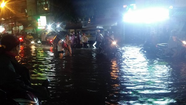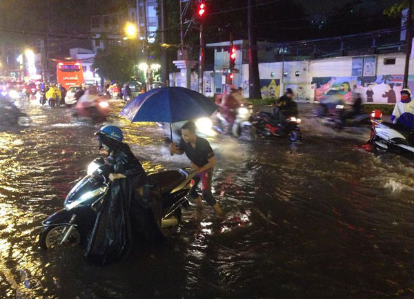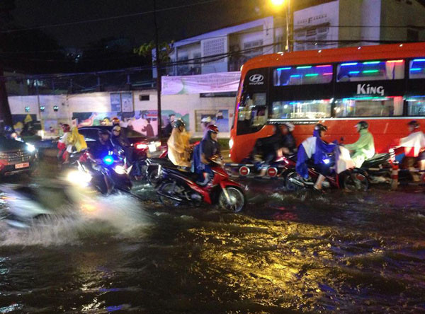 16h, mưa lớn đổ xuống quận 12, quận Gò Vấp, Tân Bình, Tân Phú... Khoảng 30 phút sau, các tuyến đường ngập nước hơn nửa mét. Xe cộ chết máy hàng loạt phải dẫn bộ bì bõm.