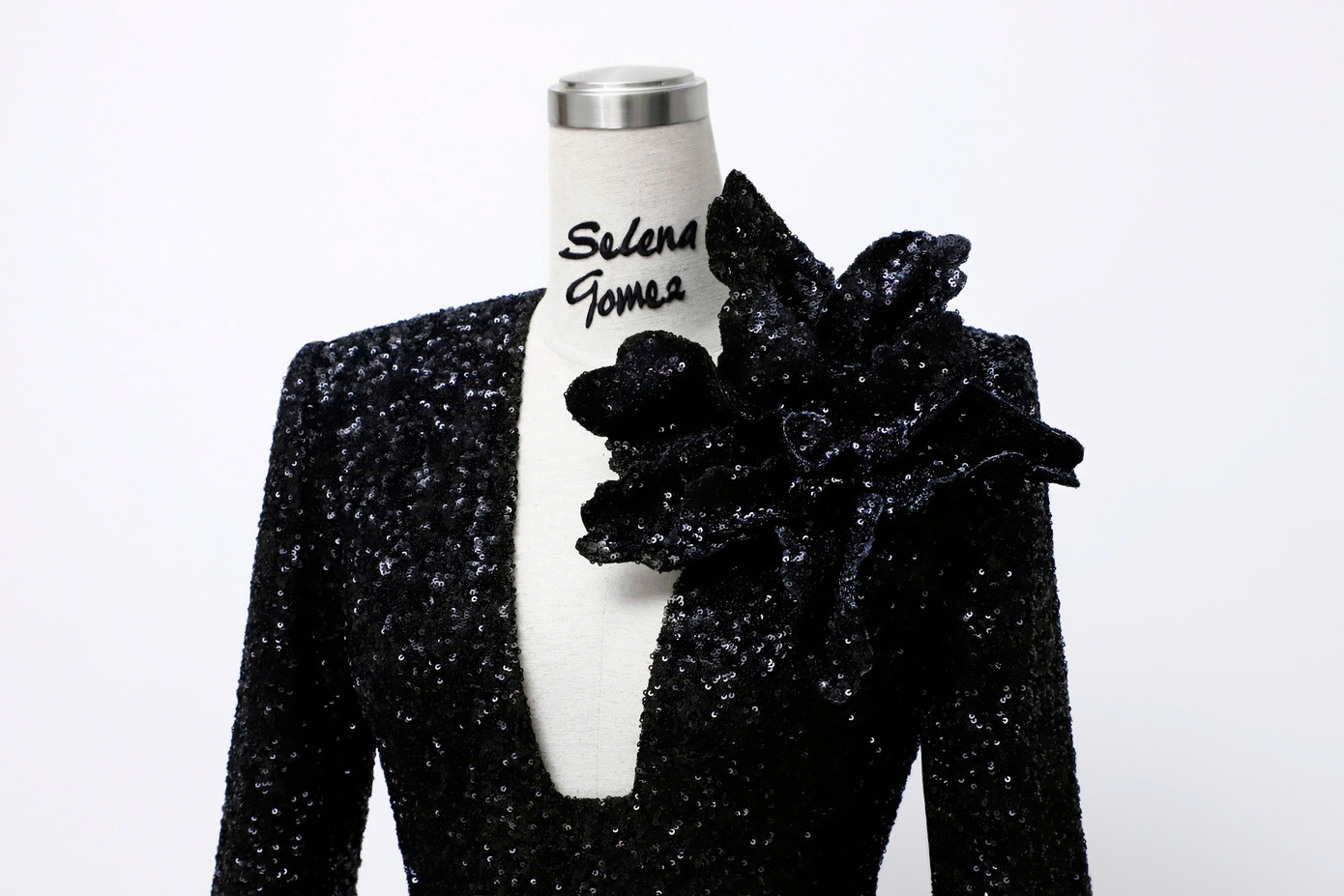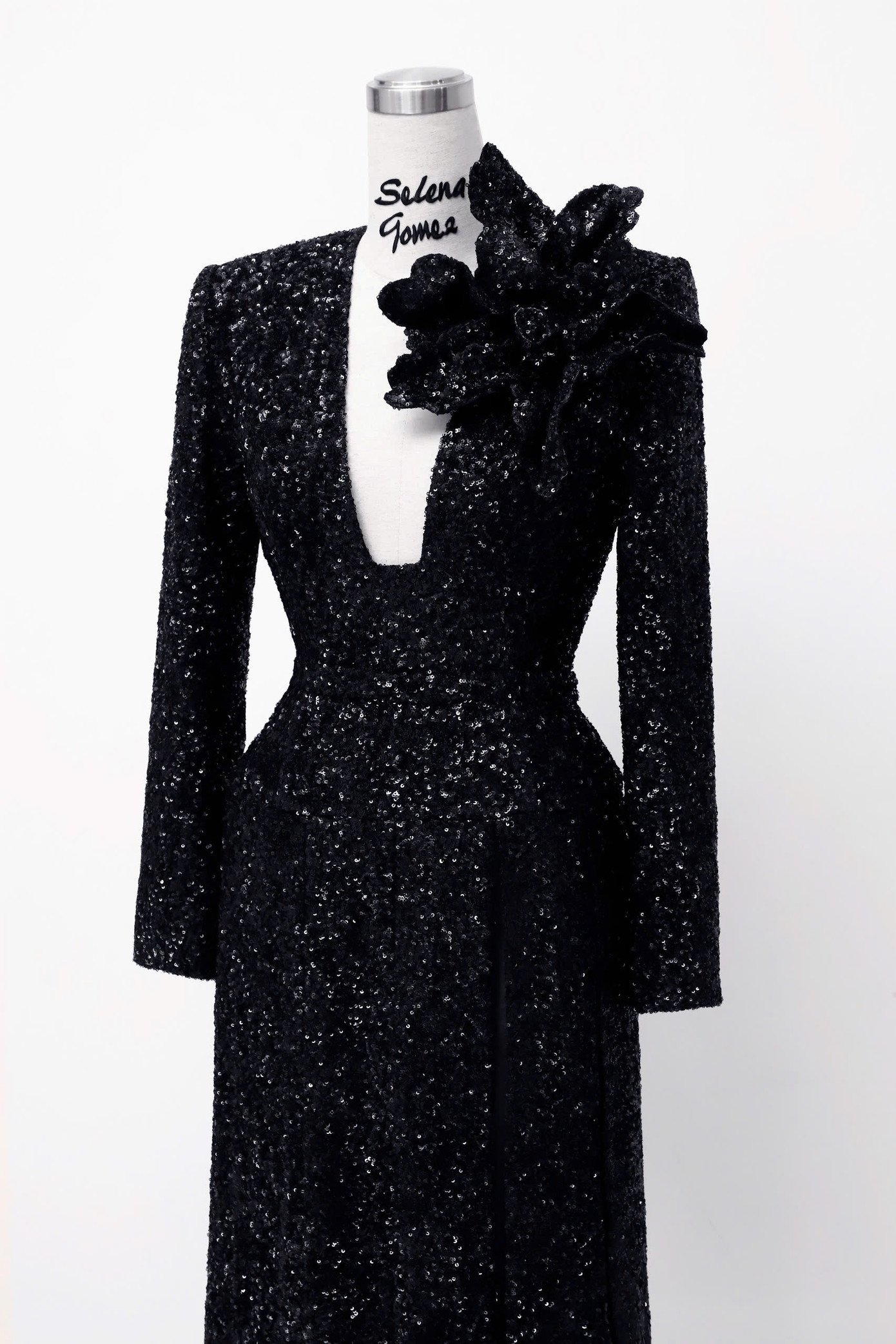 Chất liệu sequin lộng lẫy giúp Selena Gomez trở thành 'nữ hoàng đêm tiệc', cùng với những khoảng hở đầy táo bạo từ chất liệu chiffon. Để tăng thêm độ nóng bỏng, người đẹp còn phối thêm mẫu bra ren màu đen bên trong váy. “Bản gốc” vốn là thiết kế đầm dài chạm đất với điểm nhấn là đóa hoa diên vỹ cỡ đại.
