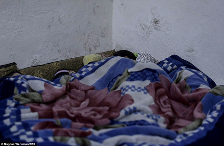 Ba chị em Esra 11, Esma 8, và Sidra 6 tuổi đang nằm ngủ với mẹ. Những đứa trẻ này may mắn hơn nhiều đứa trẻ Syria tị nạn khác vì các em có một mái nhà để trú ngụ, có chăn đệm và gối. Giờ đây, các em đang sống ở Majdal Anjar (Lebanon) nhưng cả gia đình vẫn chưa thôi bàng hoàng mỗi khi nhớ về người cha đã bị mất tích của các em.