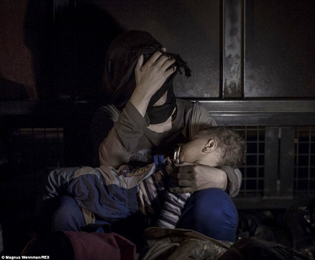 Khi bức ảnh về em bé Syria - Aylan Kurdi - bị chết đuối trên đường cùng cha mẹ vượt biển đi tị nạn gây chấn động dư luận thế giới, nhiều người đã tự nhủ rằng cậu bé Aylan chỉ đang ngủ thôi, bởi hình ảnh em nằm sấp trên bãi biển, chân tay xuôi dọc thân mình, mắt nhắm nghiền… khiến người ta muốn tin em chỉ đang trong một giấc ngủ rất say, nhưng là một giấc ngủ miên viễn. (Trong ảnh: Cậu bé Sham 1 tuổi đang nằm ngủ trong vòng tay mẹ ở biên giới giữa Áo và Serbia).
