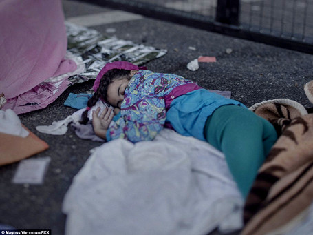 Cô bé Lamar 5 tuổi đang ngủ trong một khu rừng ở gần Horgos (Serbia). Cô bé và gia đình đã may mắn khi cả nhà đang ở ngoài đường thì một quả bom rơi trúng ngôi nhà của họ. Mất nhà, họ quyết định lên đường đi tị nạn.