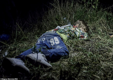 Cậu bé Ahmed 6 tuổi ngủ trên bãi cỏ ở Horgos (Serbia). Trong suốt chặng đường dài mà Ahmed đã phải thực hiện để tới được Châu Âu, cậu bé buộc phải tự mang chiếc ba lô đựng đồ dùng cá nhân của mình. Giờ đây, Ahmed sống với gia đình người bác sau khi cha cậu qua đời ở quê nhà Deir ez-Zor, miền bắc Syria.