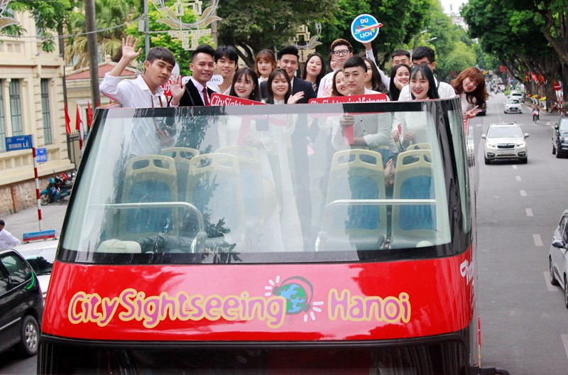 Trong ngày đầu tiên xe buýt du lịch 2 tầng hoạt động trở lại, có rất đông hành khách đã lên xe, chọn tầng để ngồi ngắm phố phường Hà Nội.