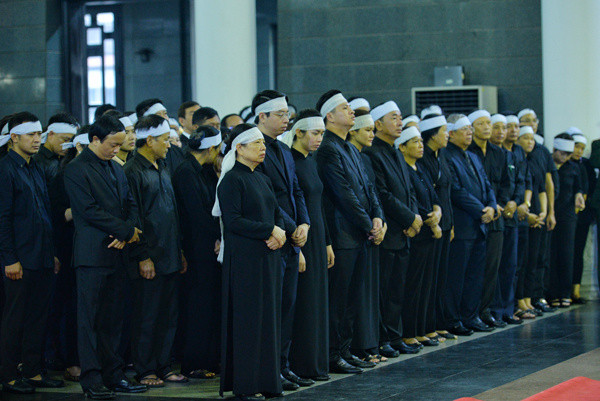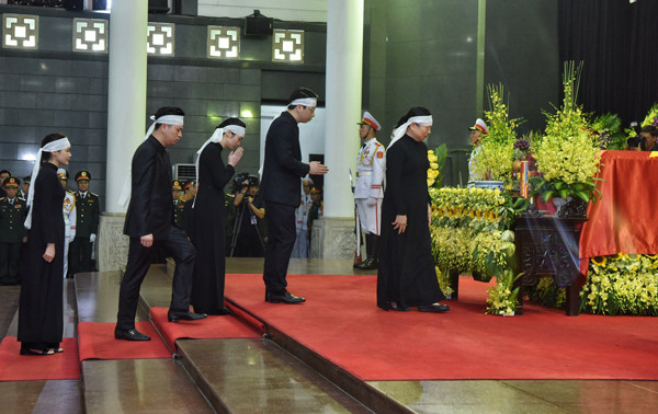 Sau lời tuyên bố ngắn gọn của Phó thủ tướng Trương Hòa Bình, phút mặc niệm bắt đầu. Trong ảnh: Gia đình, họ hàng nội ngoại Chủ tịch nước Trần Đại Quang trong giây phút mặc niệm. Ảnh: Vnexpress