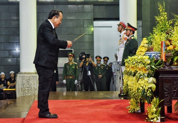 Phó thủ tướng Trương Hòa Bình, đại diện Ban tổ chức lễ tang thắp hương trước giờ làm lễ truy điệu sáng 27/9. Ảnh: Vnexpress