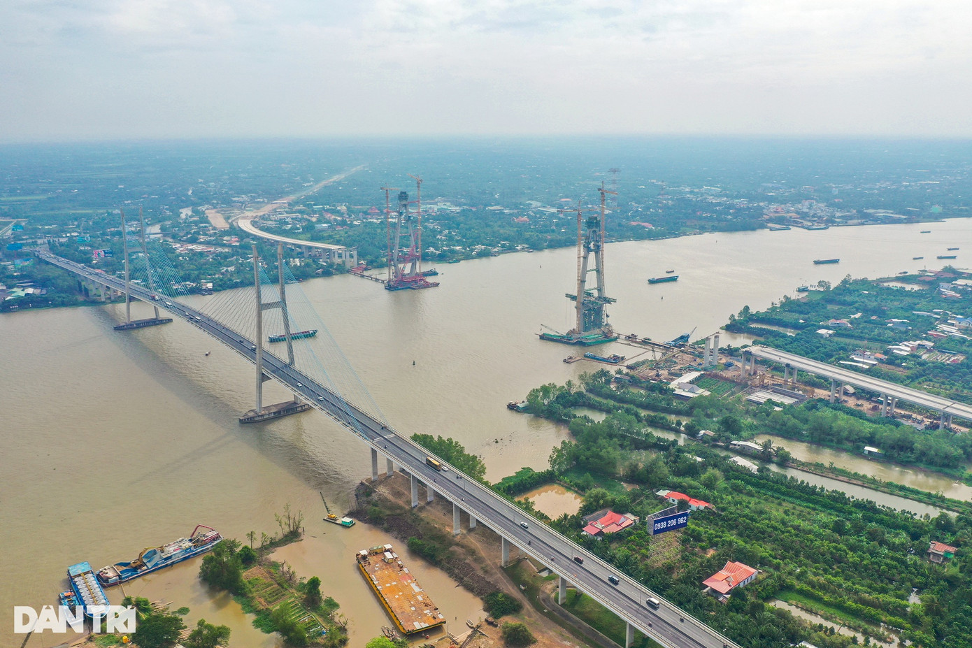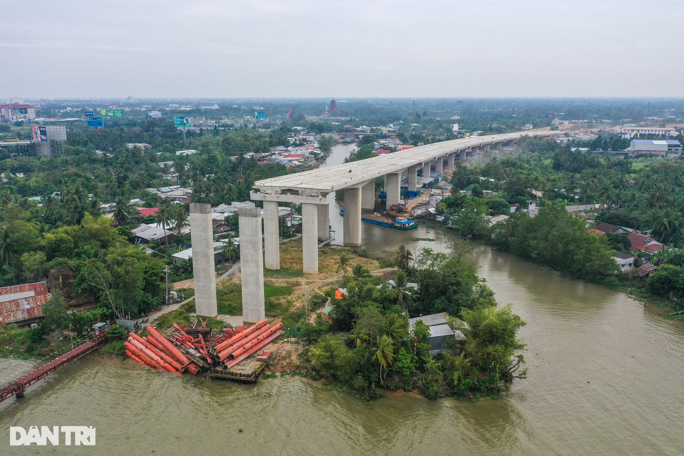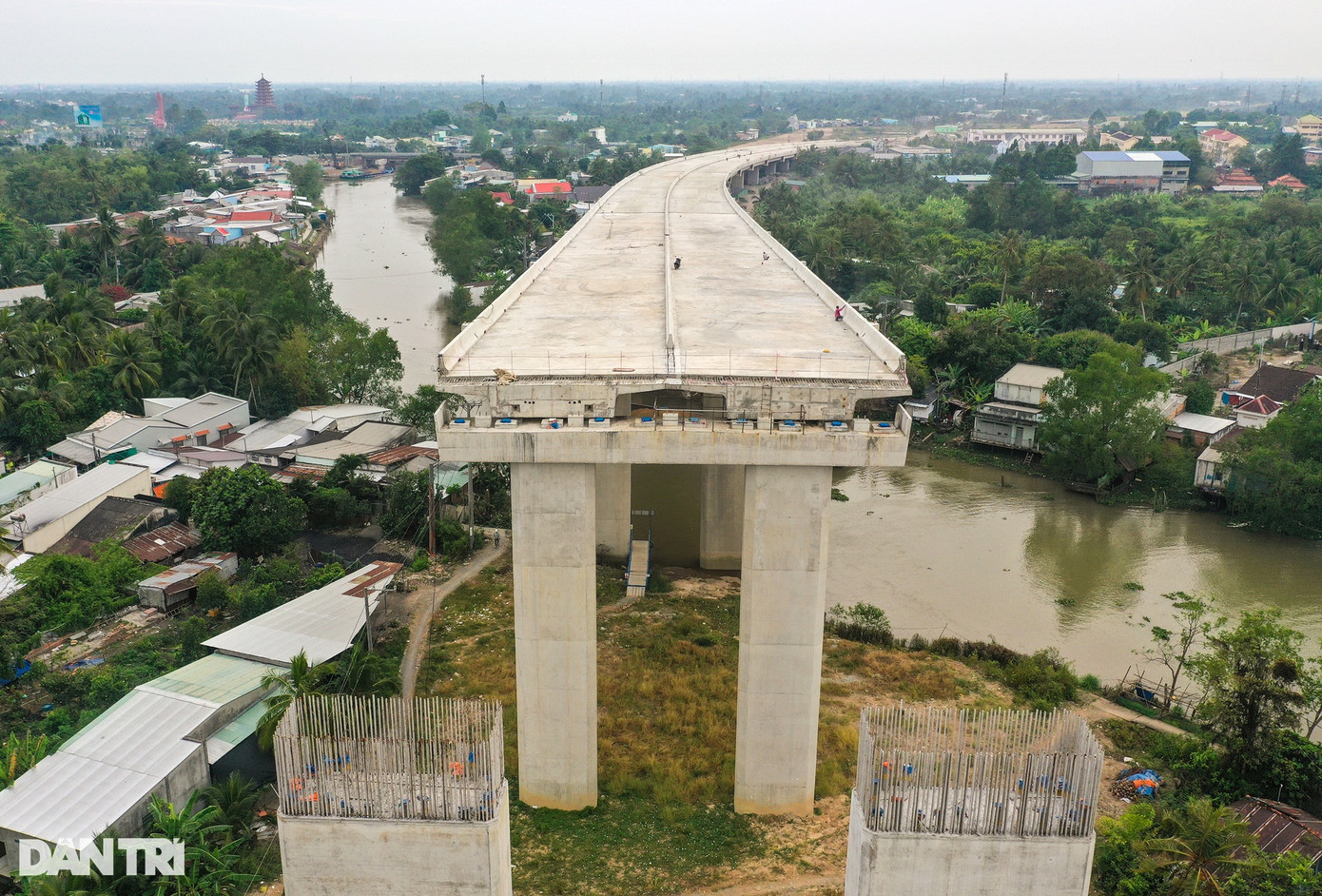 Còn phía cầu dẫn thuộc địa phận tỉnh Tiền Giang gồm 14 nhịp Super T và toàn bộ kết cấu phần dưới từ mố M0 đến trụ T13 đã đạt hơn 97%.