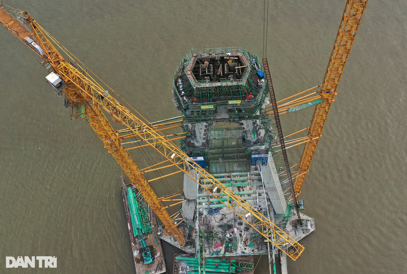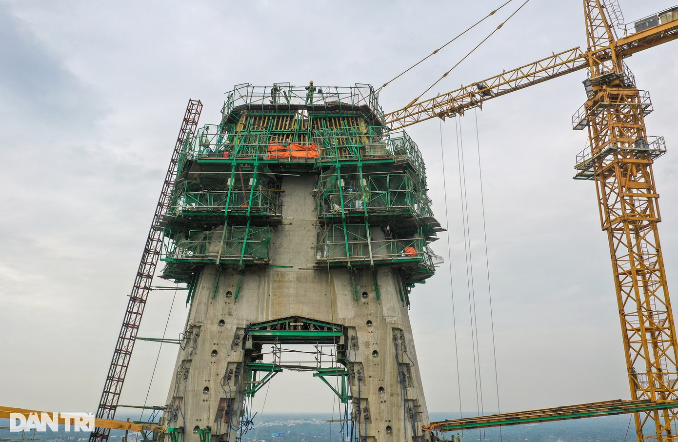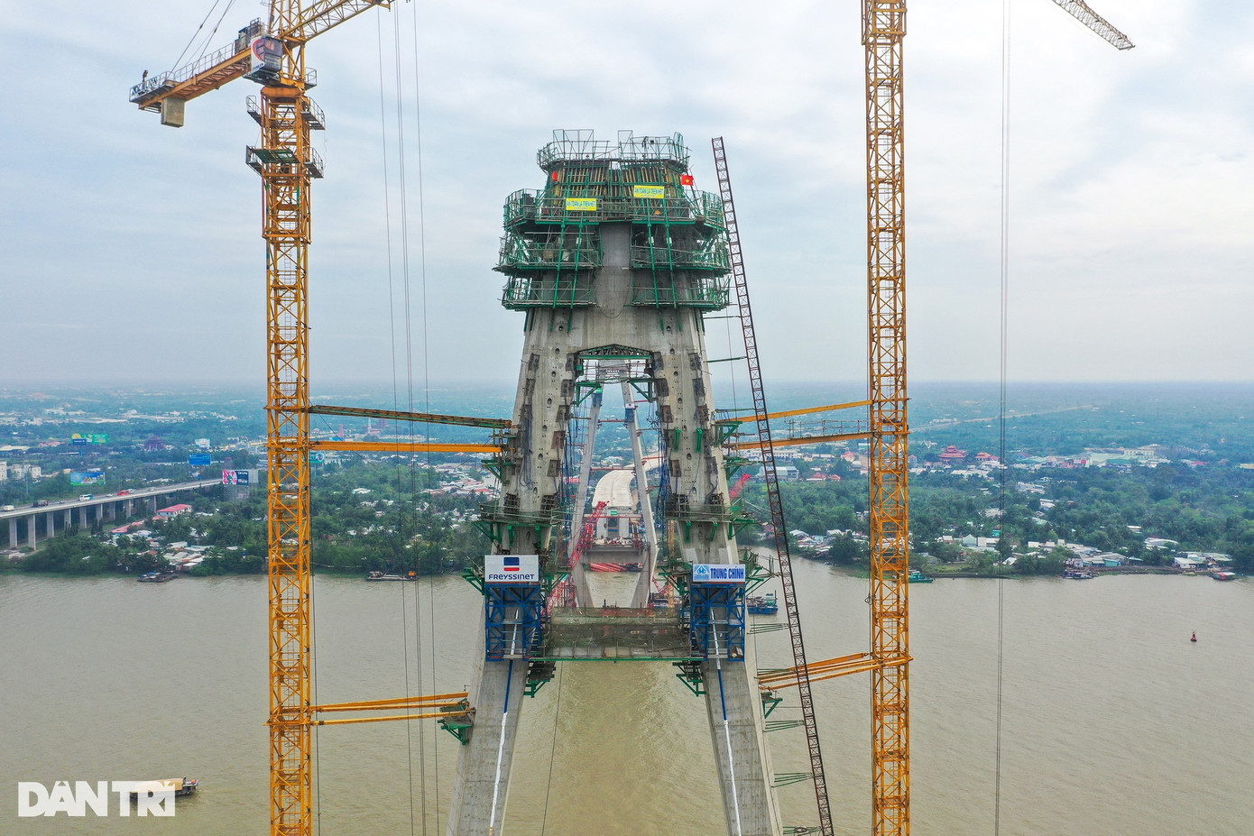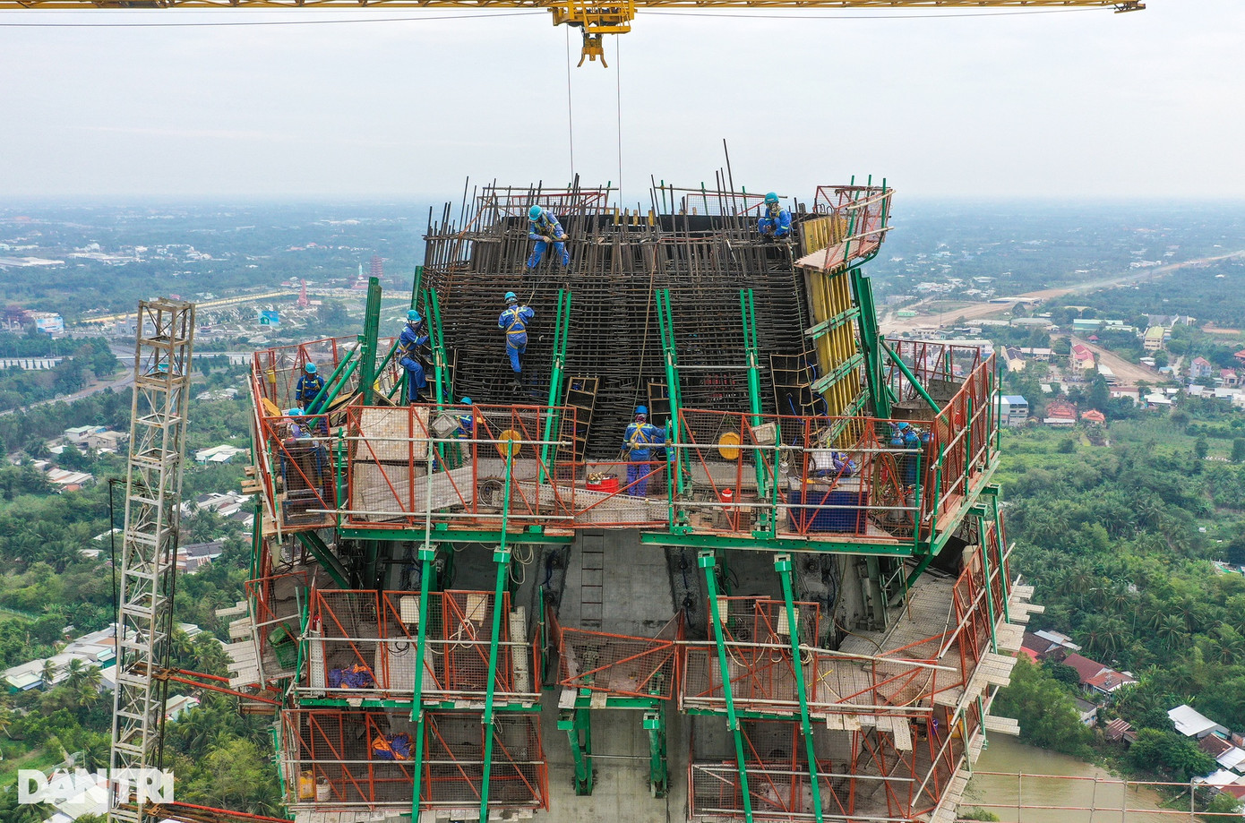 Đơn vị thi công cho biết việc nâng 4 xe đúc bằng thép lắp dựng vào 2 trụ tháp được hoàn thành trước Tết Nguyên đán, để phục vụ việc thi công các đốt dầm cầu chính. Mỗi xe dài 35m, rộng 23m, nặng khoảng 250 tấn.
