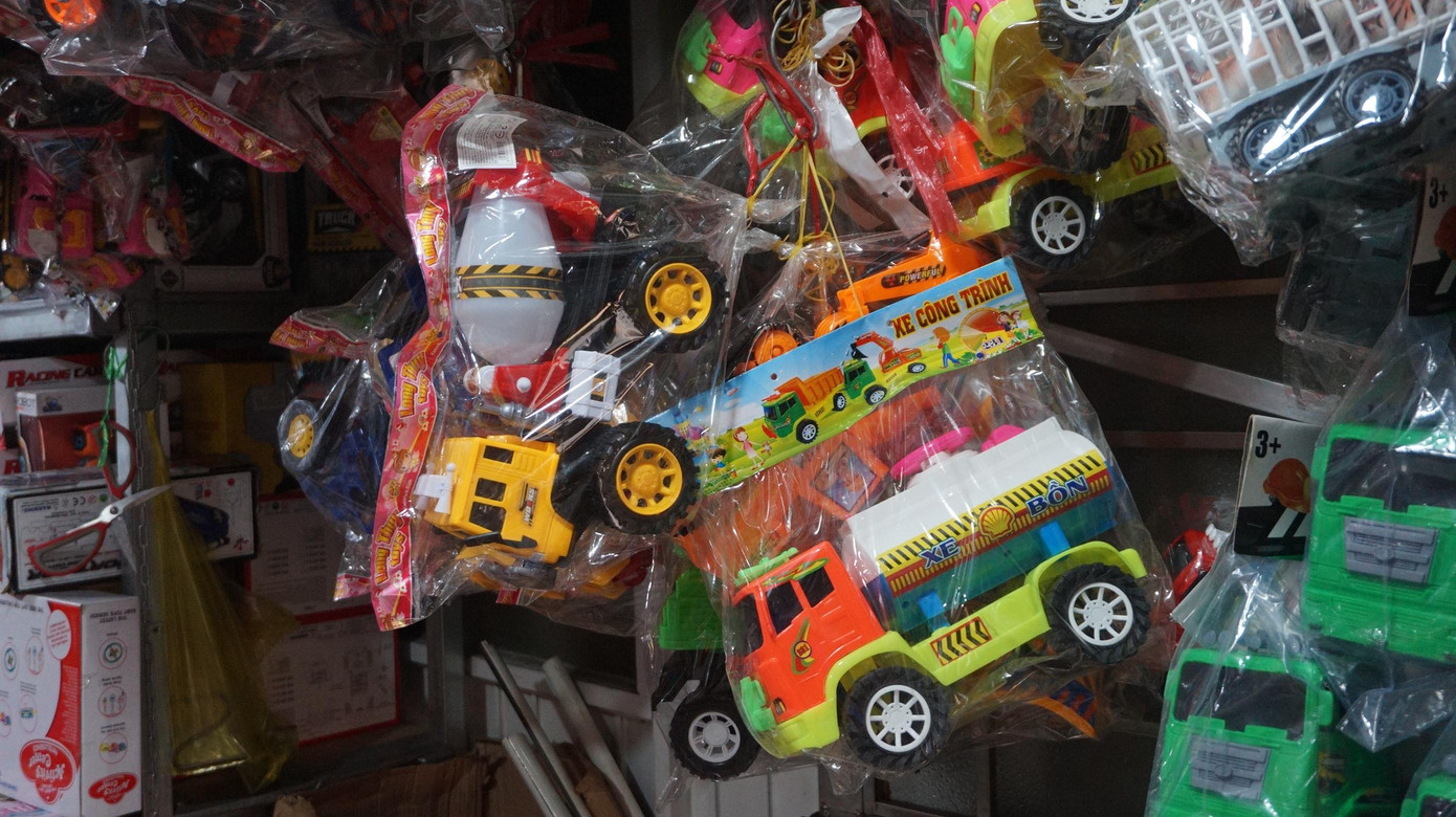| Các mặt hàng đồ chơi trẻ em được bày bán tại các cửa hàng trên đường Chu Văn An, quận 6, TP HCM. |