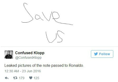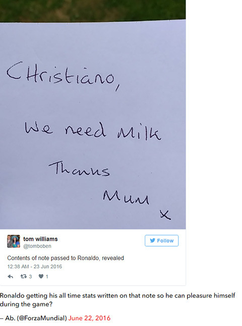 Một tờ giấy nhỏ đã được HLV Fernando Santos đưa cho Eliseu để gửi tới Ronaldo khi trận đấu giữa Bồ Đào Nha và Hungary đang có tỷ số hòa 3-3. Đã có một chỉ thị được gửi đến CR7.