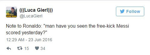 "Anh đã xem siêu phẩm sút phạt của Messi ngày hôm qua chưa?" CĐV châm chọc Ronaldo chưa thể có bàn thắng nào từ đá phạt