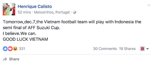 "Ngày mai, 7/12, tuyển Việt Nam sẽ đấu Indonesia ở bán kết AFF Suzuki Cup. Tôi tin. Chúng ta có thể. Chúc may mắn nhé Việt Nam", Henrique Calisto chia sẻ trên trang Facebook hôm 6/12.