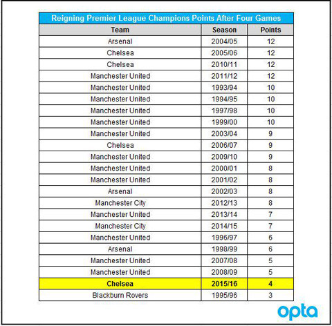 Đây là sự khởi đầu tồi tệ của một nhà ĐKVĐ, chỉ có Blackburn mùa 1995/96 bắt đầu chiến dịch bảo vệ ngôi vương kém cỏi hơn (3 điểm qua 4 vòng). Hiện, Chelsea chỉ có 4 điểm và đứng thứ 13 trên BXH sau 4 vòng đấu.