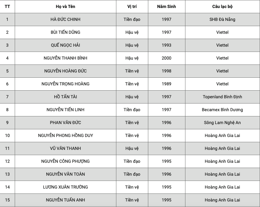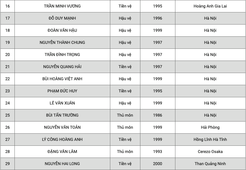Theo dự kiến ban đầu, danh sách tuyển Việt Nam sẽ gồm 28 cầu thủ, trong đó thủ môn Đặng Văn Lâm sẽ bay trực tiếp từ Nhật Bản sang Dubai. Tuy nhiên, danh sách hiện tại do HLV Park Hang Seo “gút” lại vẫn có 29 người. Tiền vệ Nguyễn Hai Long đã được ông Park đưa từ đội U22 Việt Nam lên.