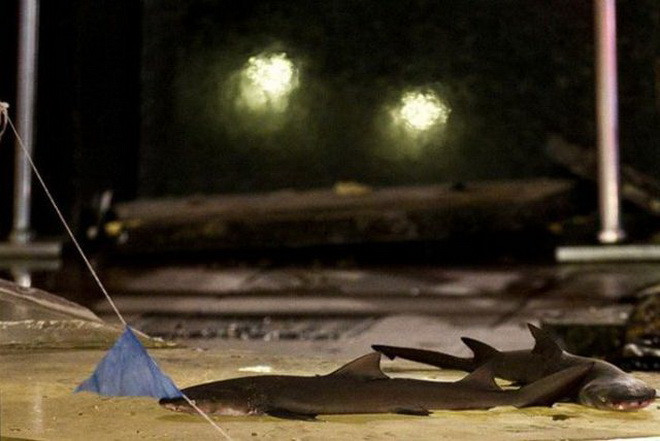Ba con cá mập chanh, rùa và nhiều loài cá nhỏ khác bị văng khắp sàn trung tâm thương mại Orient ở Thượng Hải.