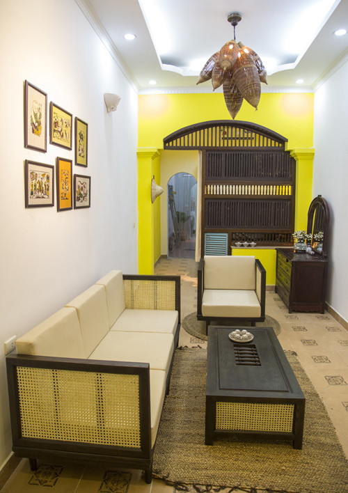Nhà được sửa mới nhưng sử dụng đồ nội thất tông màu nâu đậm đem lại cảm giác thâm trầm, ấm cúng. Trên tường treo nhiều bức tranh truyền thống.