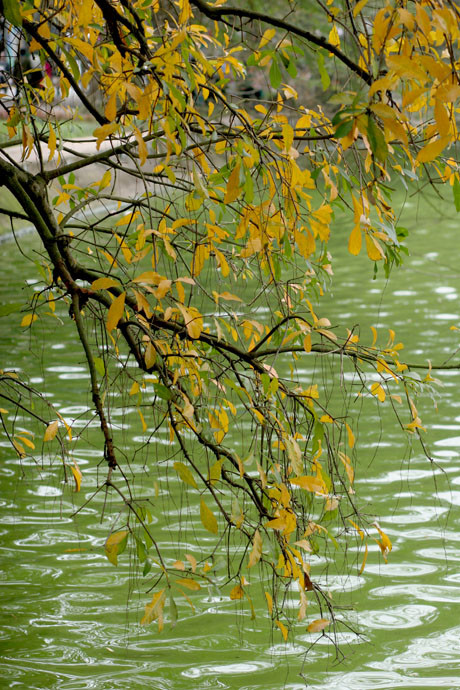 Những cây lộc vừng lá vàng óng ánh rủ xuống mặt hồ.