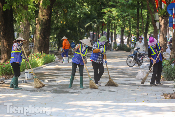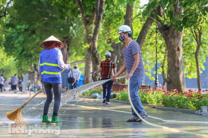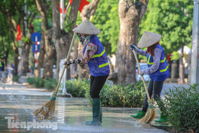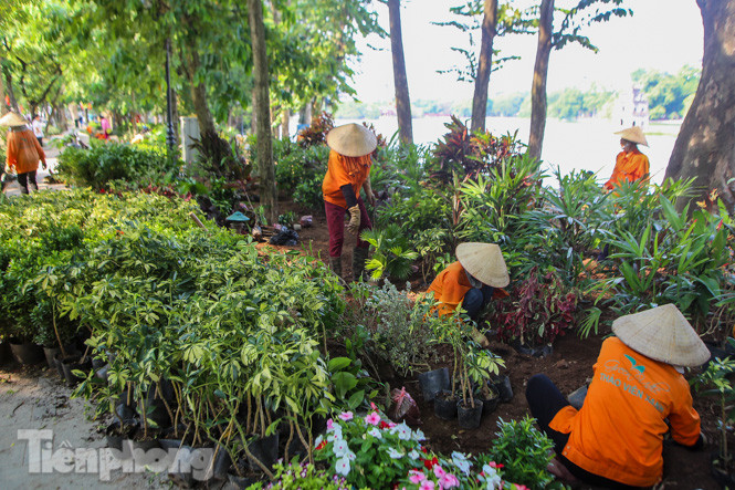 Để chào mừng ngày lễ Quốc khánh 2/9, đội công nhân tích cực dọn dẹp, rửa vỉa hè, trồng cây, trang trí bồn hoa để phục vụ người dân trong ngày nghỉ lễ này. Năm nay, hồ Hoàn Kiếm mang một diện mạo hoàn toàn mới mẻ, bền vững sau khi thi công "Dự án đầu tư xây dựng, cải tạo, chỉnh trang khu vực xung quanh hồ Hoàn Kiếm".