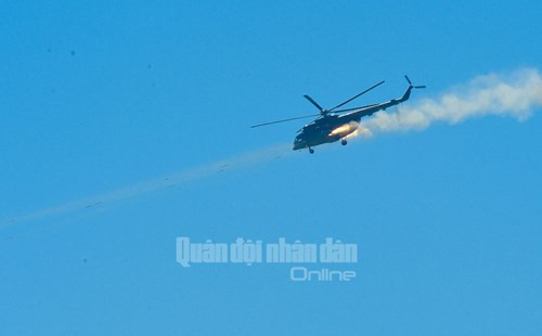Một chiếc trực thăng vũ trang thể hiện sức mạnh hoả lực trên trường bắn Như Xuân.
