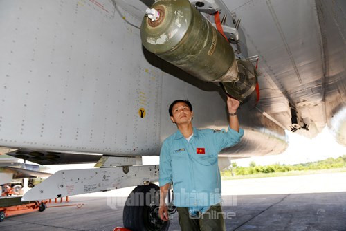Là những chuyến bay sử dụng vũ khí, nên máy bay được các thành phần kiểm tra, bàn giao chặt chẽ. Trong ảnh: phi công tiến hành kiểm tra bom được treo lắp trên máy bay trước giờ xuất kích.