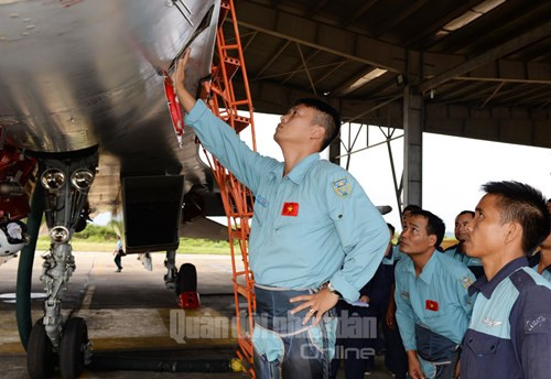 Nhân viên kỹ thuật hàng không cùng phi công SU-30MK2 tiếp thu máy bay trong ban bay bắn, ném bom. Đây là đợt hội thao huy động tổng lực các loại máy bay của lực lượng không quân trên khắp 3 miền Bắc, Trung, Nam. Ngoài tiêm kích đa năng SU-30MK2, còn có các loại máy bay khác...