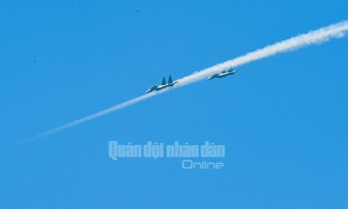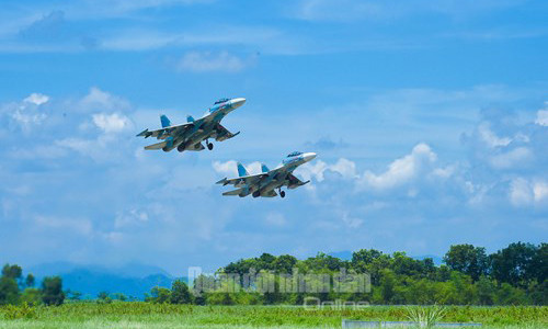 Động tác cất cánh biên đội thể hiện trình độ kỹ thuật lái điêu luyện của các phi công đang làm chủ "hổ mang chúa" SU-30MK2.