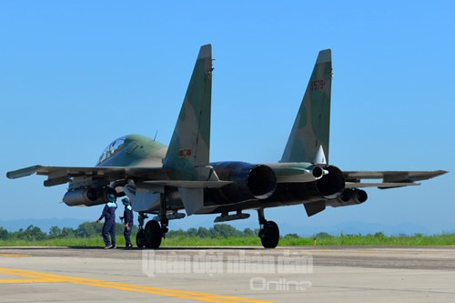 Phía xa trên đường băng là biên đội SU-30MK2 chuẩn bị cất cánh thực hiện nhiệm vụ công kích mục tiêu.