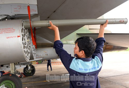 Một điểm mới trong hội thao năm nay là phi công công kích mục tiêu mặt đất hoặc bằng bom và rốc-két, hoặc bằng bom và pháo. Nhân viên kỹ thuật lắp đạn pháo trên SU-30MK2.