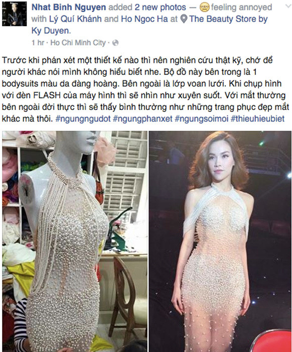 Ngay lập tức, trên trang Facebook cá nhân, chuyên gia trang điểm Nhật Bình, một người bạn thân thiết của Hồ Ngọc Hà và Lý Quí Khánh đã lên 'bênh'. Theo anh, chiếc váy này có hai lớp, lớp trong cùng là một lớp lót màu da và lớp bên ngoài là voan trong. Do điều kiện ánh sáng và góc chụp, đặc biệt, khi tác nghiệp với đèn flash, lớp lót màu da sẽ "đánh lừa" thị giác người xem, làm chiếc váy trở nên trong suốt. Ca sỹ Minh Hằng cũng đã từng gặp phải tai nạn này.