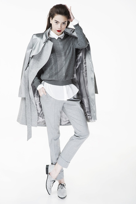 Để phối theo phong cách menswear, Hà Hồ chọn tông màu lạnh là trắng và xám - một trong những gam màu thời thượng của mùa đông năm nay. Cô chọn cách mix layer khi mặc sơ mi bên trong sweater, quần âu kết hợp áo măng tô. Để phù hợp với vẻ cổ điển, sang trọng của trang phục, Hà Hồ chọn cách trang điểm tối giản với đôi môi đỏ là điểm nhấn duy nhất.