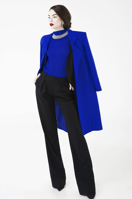 Với ưu điểm tông lạnh, xanh cobalt có thể kết hợp với sắc thái trung tính như đen, trắng và nhiều màu nhạt khác. Phong cách tối giản, nhấn ở vòng cổ kim loại là cách giúp người đẹp toát lên vẻ thanh lịch.