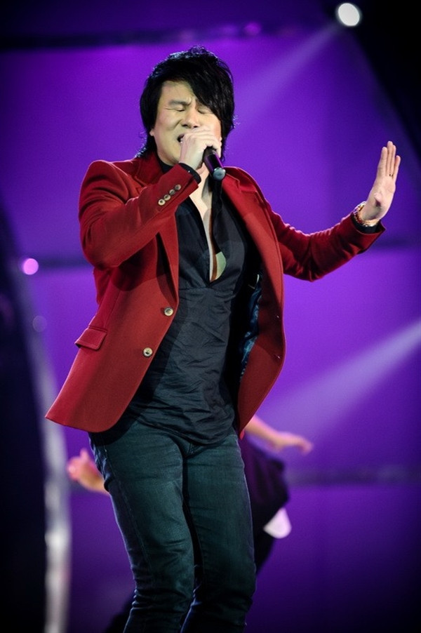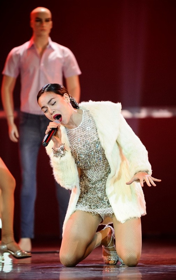 Trong đoạn cao trào, nữ ca sĩ xinh đẹp quỳ xuống sân khấu với gương mặt đau khổ, nhập tâm vào từng câu hát.
