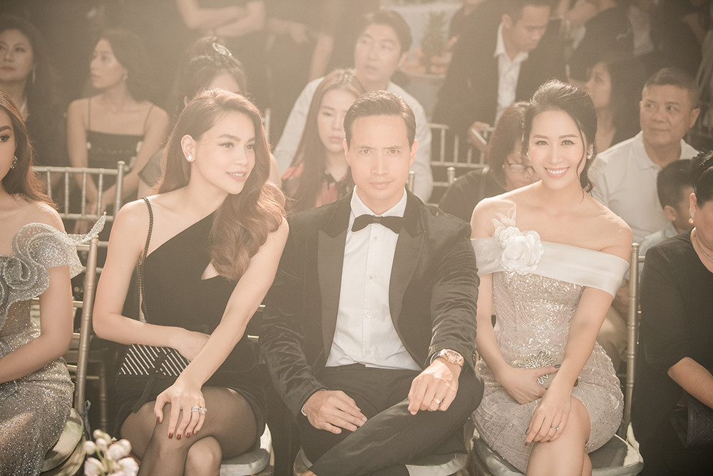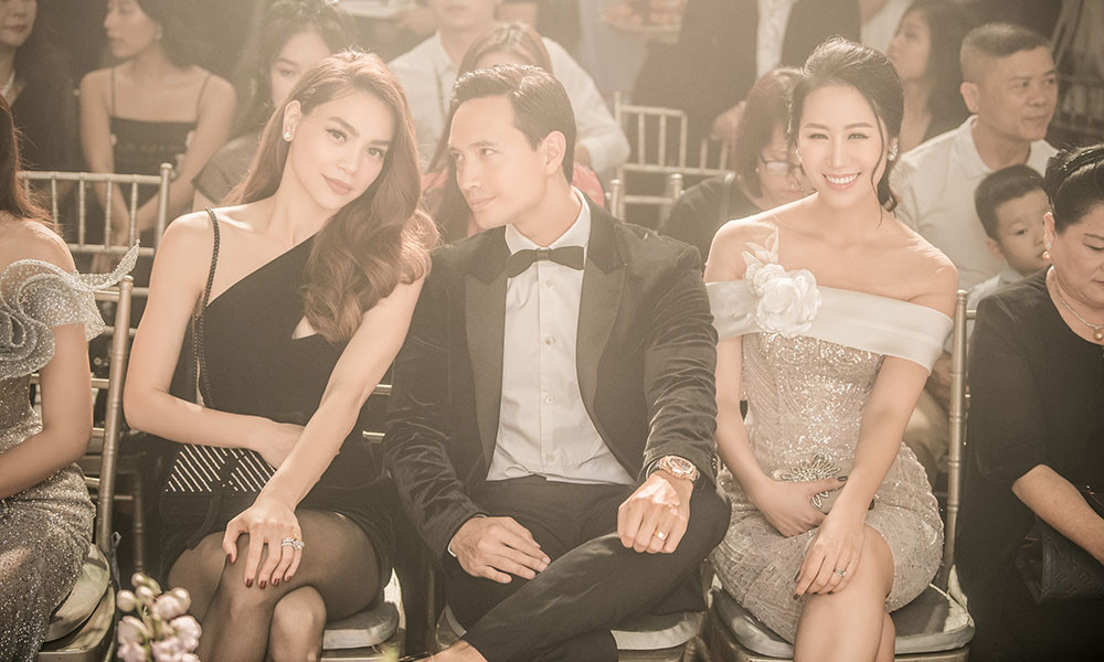 Hà Hồ và Kim Lý diện trang phục màu đen ton-sur-ton nhưng vẫn nổi bật. Mặc dù ngồi cạnh Hoa hậu Dương Thuỳ Linh và một 'rừng' người đẹp nhưng họ vẫn không ngại thể hiện những cử chỉ thân mật.