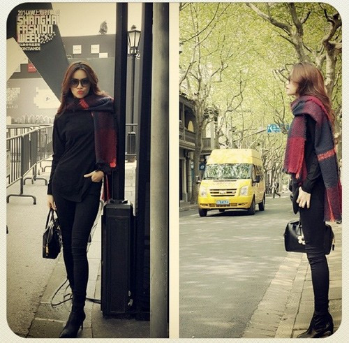 Trên một góc phố Thượng Hải, ''Nữ hoàng giải trí'' tiếp tục trưng diện tông màu đen yêu thích, phụ kiện đi kèm đồng màu. Điểm nhấn là chiếc khoăn quàng cổ màu đỏ - đen ấm áp.
