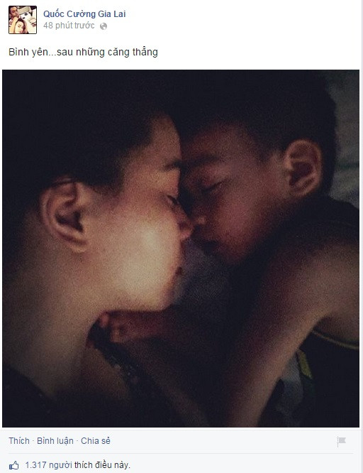 Cách đây ít phút, Cường đô la vừa đăng tải hình ảnh nữ ca sĩ Hồ Ngọc Hà và con trai Subeo cùng dòng trạng thái “Bình yên… sau những căng thẳng”. Tấm ảnh cho thấy vợ và con anh quay mặt vào nhau, ngủ ngon lành.