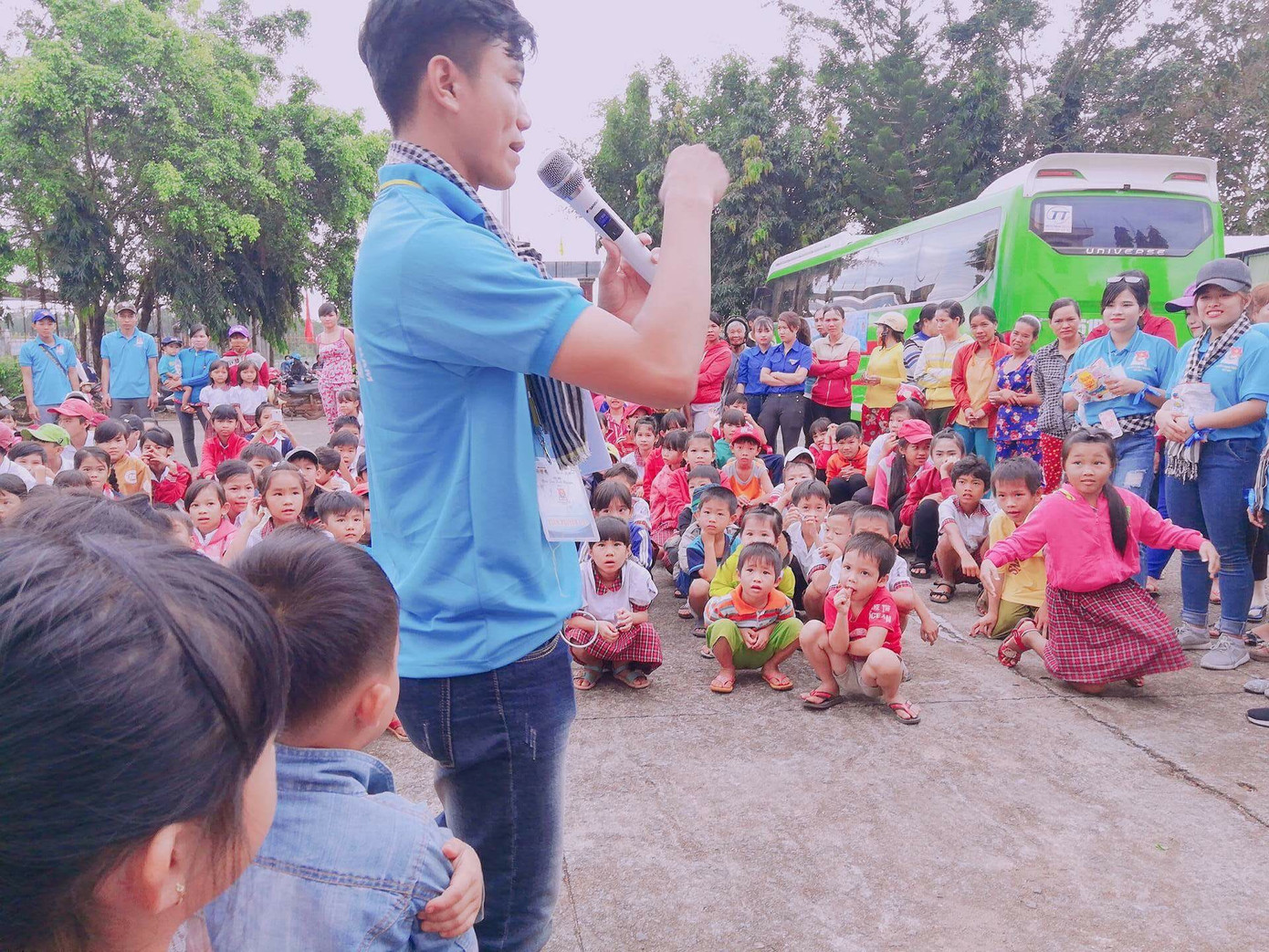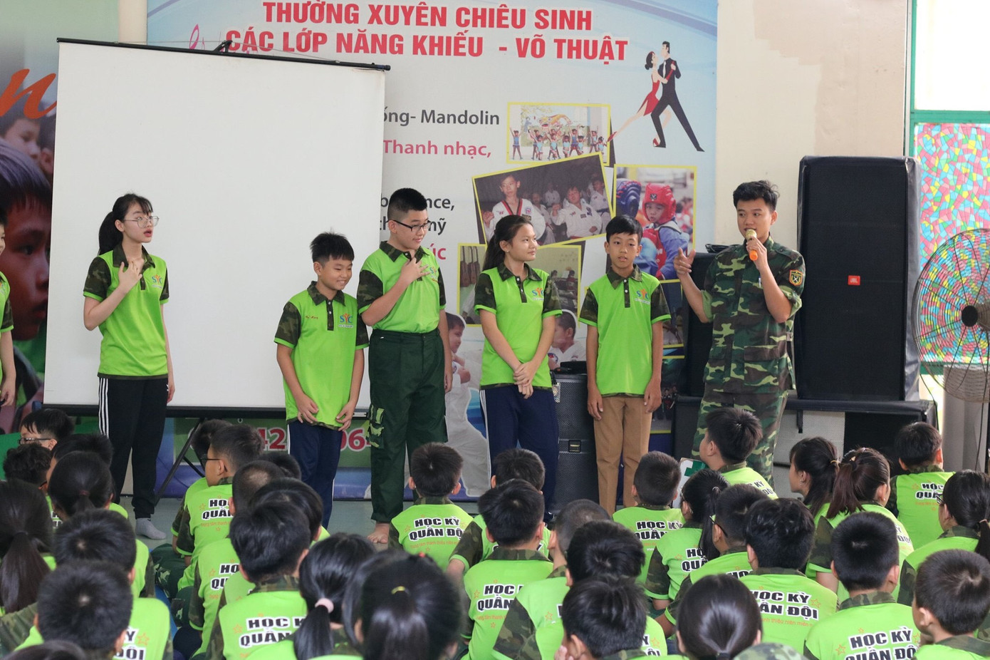 Hồ Trà Phal (ngoài cùng bên trái) là "anh nuôi" trong các chương trình Học kỳ quân đội. (Ảnh: NVCC) "Anh nuôi" của các em thiếu nhi