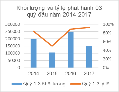 Về giá trị tương đối, khối lượng phát hành 03 quý đầu năm 2015 chỉ đạt mức 50% so với tổng khối lượng phát hành trong năm; trong khi tỷ số này của năm 2014 và 2016 lần lượt là 84% và 89%.