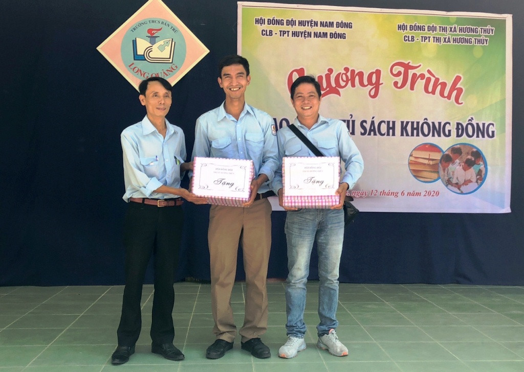 Trước đó, Hội đồng Đội thị xã Hương Thủy phối hợp với Hội đồng Đội huyện Nam Đông tiến hành trao tặng “Tủ sách 0 đồng” cho Trường THCS bán trú Long Quảng, huyện Nam Đông, TT-Huế.