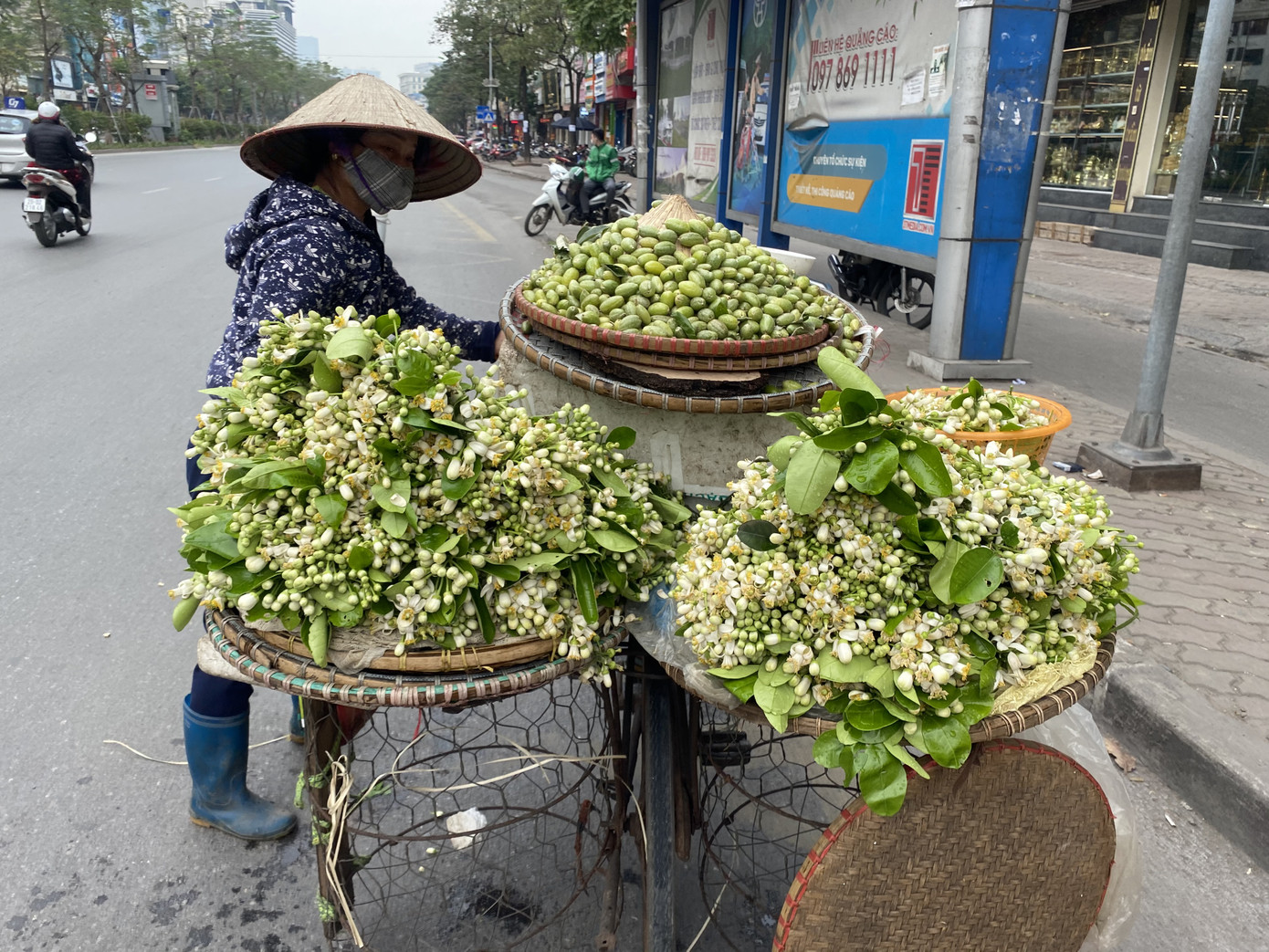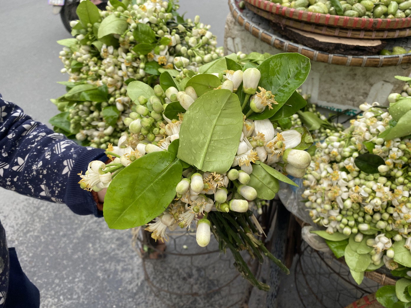 Từ giữa tháng 2, những chiếc xe chở đầy hoa bưởi đã có mặt trên nhiều tuyến phố Thủ đô. Hoa được bày cẩn thận trên mẹt, cùng người bán đi rong ruổi khắp phố phường.