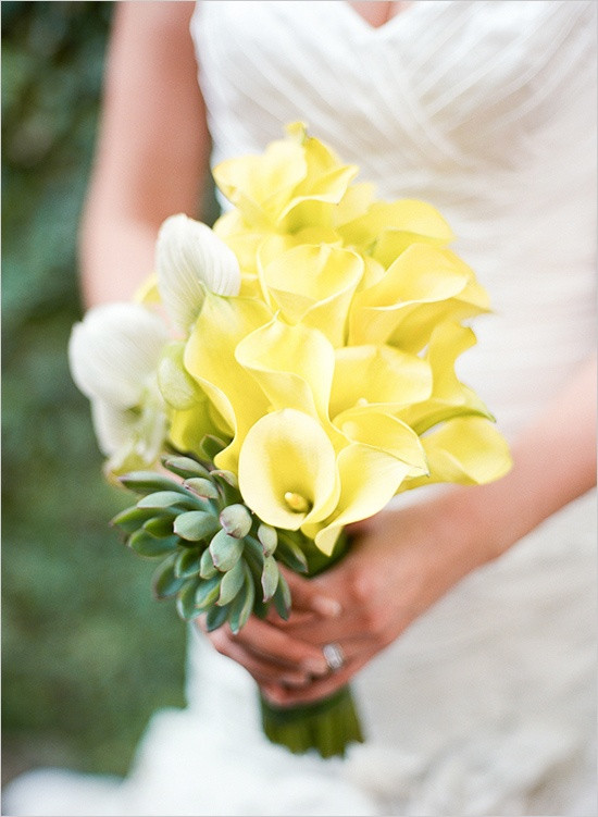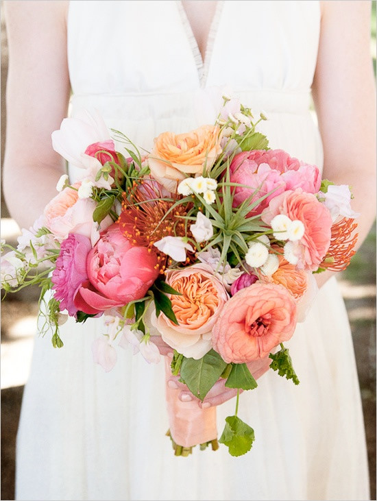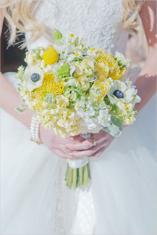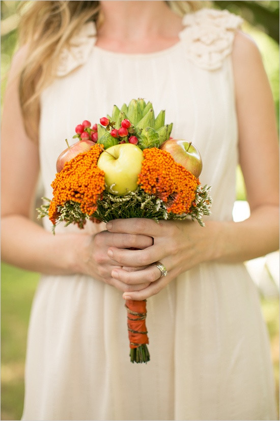Chỉ cần chọn những bông hoa đủ màu sắc tươi tắn, xen kẽ có điểm nhấn, đôi khi trái chanh hay quả táo cũng có thể điểm xuyết thêm cho lạ mắt, cùng với ruy-băng mềm mại bó tròn là bạn đã hoàn thành bó hoa cưới nhẹ nhàng nữ tính.