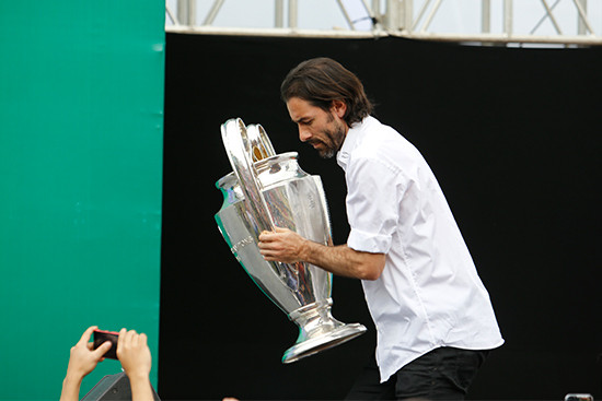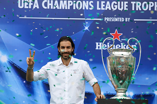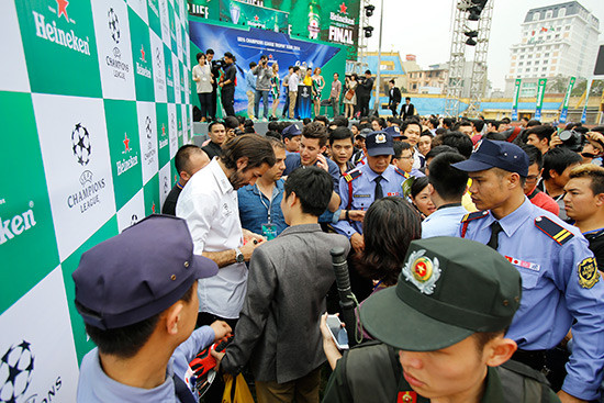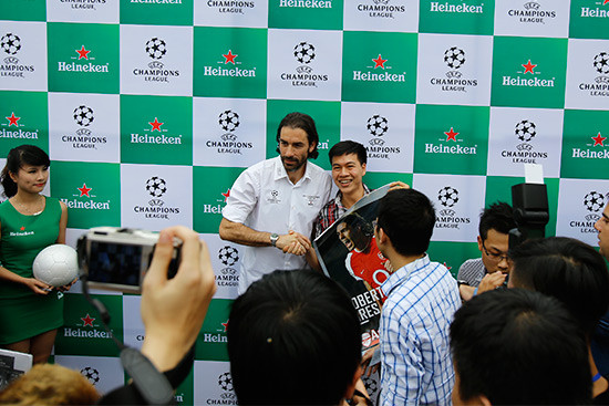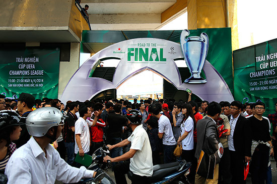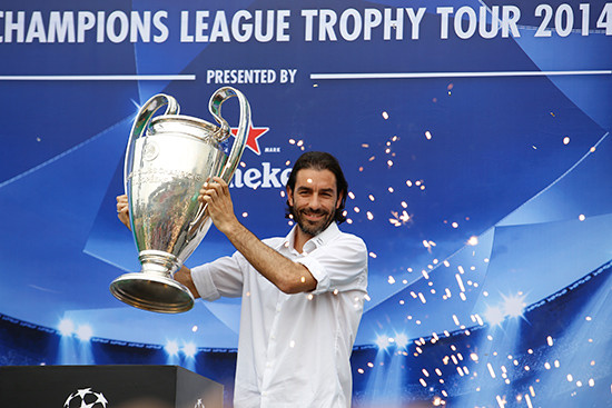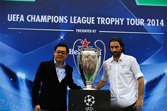 Ngày 6/4/2014, cúp UEFA Champions League và đại sứ của giải đấu Robert Pires đem những trải nghiệm bóng đá độc đáo đến với fan Hà Nội. Trong ảnh: Robert Pires bên chiếc Cup Champions League danh giá.