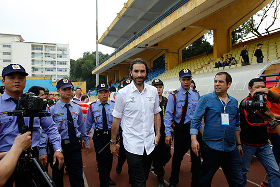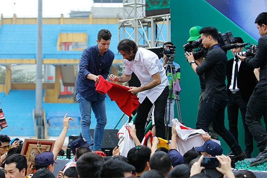 Pires đã di chuyển từ TP.HCM đến Hà Nội rồi đến thẳng sân Hàng Đẫy. Dù khá mệt nhưng cựu ngôi sao đội Arsenal trong trang phục giản dị, vẫn luôn giữ nụ cười tươi tắn trước người hâm mộ.