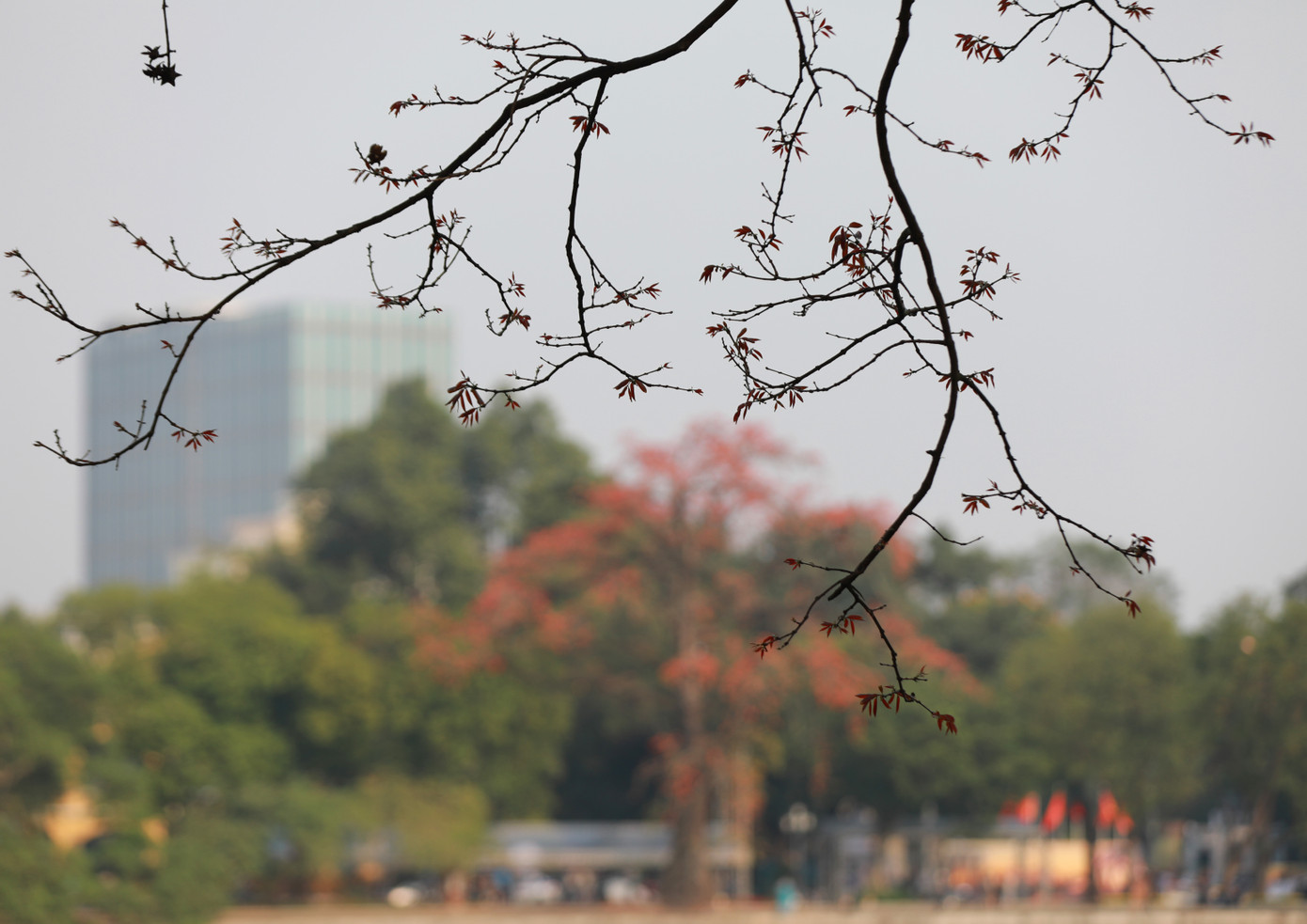 | Trên những cành cây khẳng khiu, trơ trọi dưới tác động của mùa đông lạnh giá, hoa gạo bừng tỉnh vươn mình nở rộ trong suốt hai tuần. Những bông hoa đỏ rực như những đốm lửa đầy nhiệt huyết, đánh tan không khí u ám và những cơn mưa phùn dai dẳng. |