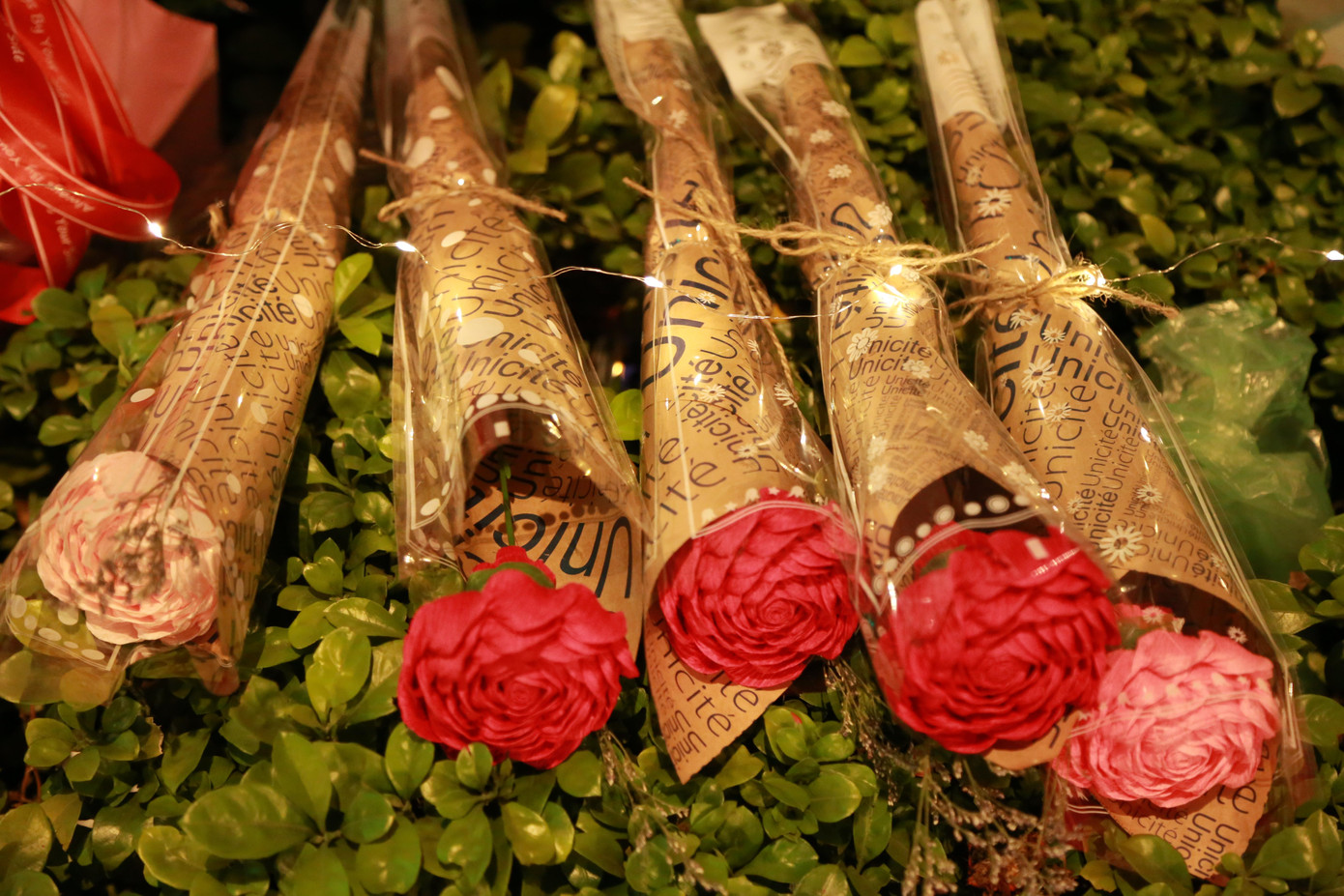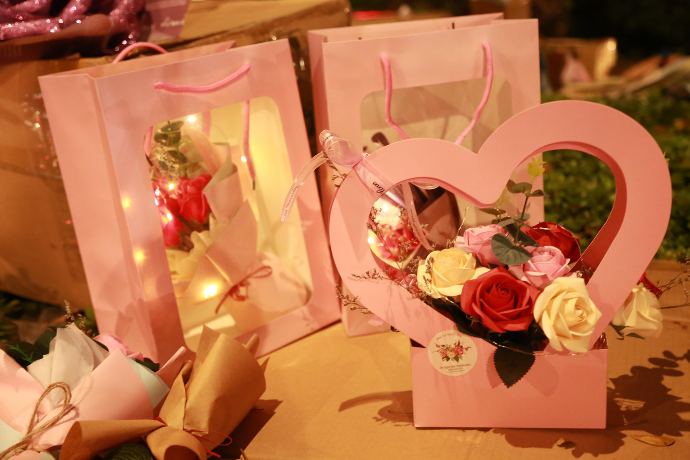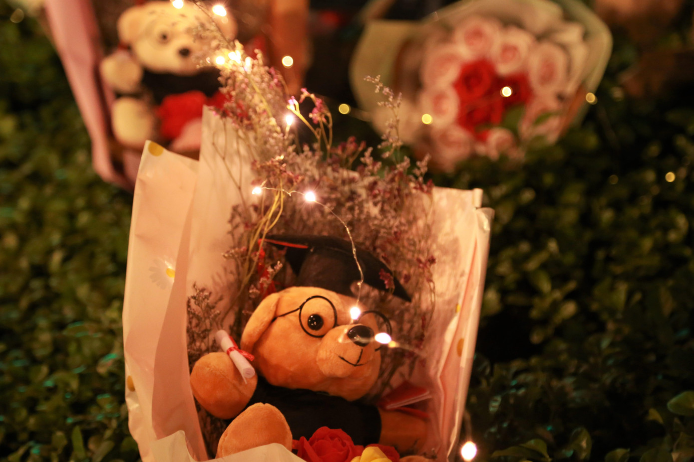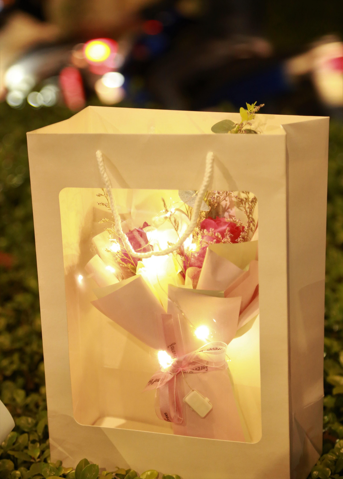 | Cũng là bó hoa, chú gấu thường thấy, nhưng đã được điểm xuyết xung quanh bằng những chiếc đèn led nhấp nháy, tạo hiệu ứng bắt mắt và sinh động. |
