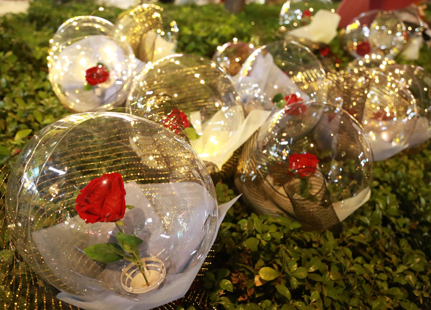 | Đóa hồng được lồng trong một quả bóng trong suốt và giăng dây đèn led bên ngoài. |