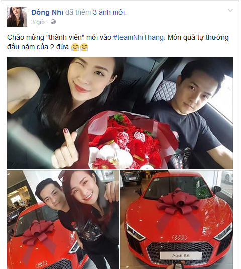 Được biết, “thành viên mới” mà Đông Nhi và Ông Cao Thắng mới tậu là chiếc xe Audi R8V10plus thuộc dòng xe sang có giá trị lên tới 13 tỷ đồng. Theo nhiều nguồn tin, siêu xe này được Ông Cao Thắng đặt hàng mua tặng cho bạn gái. Tại Mỹ, R8 V10 Plus có giá khởi điểm vào khoảng 190.000 USD.
