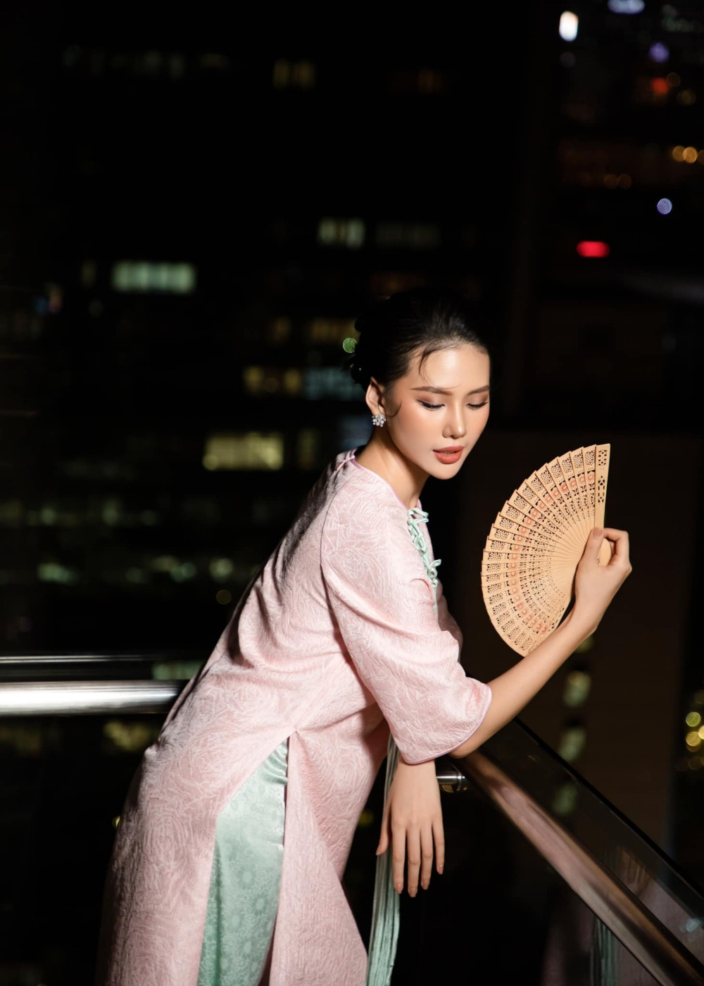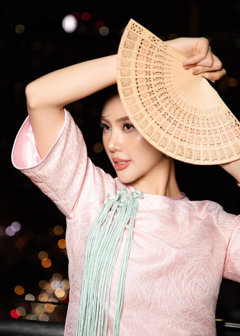 Mẫu áo dài dáng xuông, mang gam màu hồng pastel dịu nhẹ, giúp nhan sắc của Hoa hậu Bùi Quỳnh Hoa trở nên đằm thắm và hút mắt hơn.