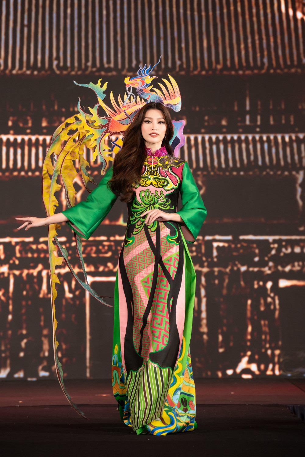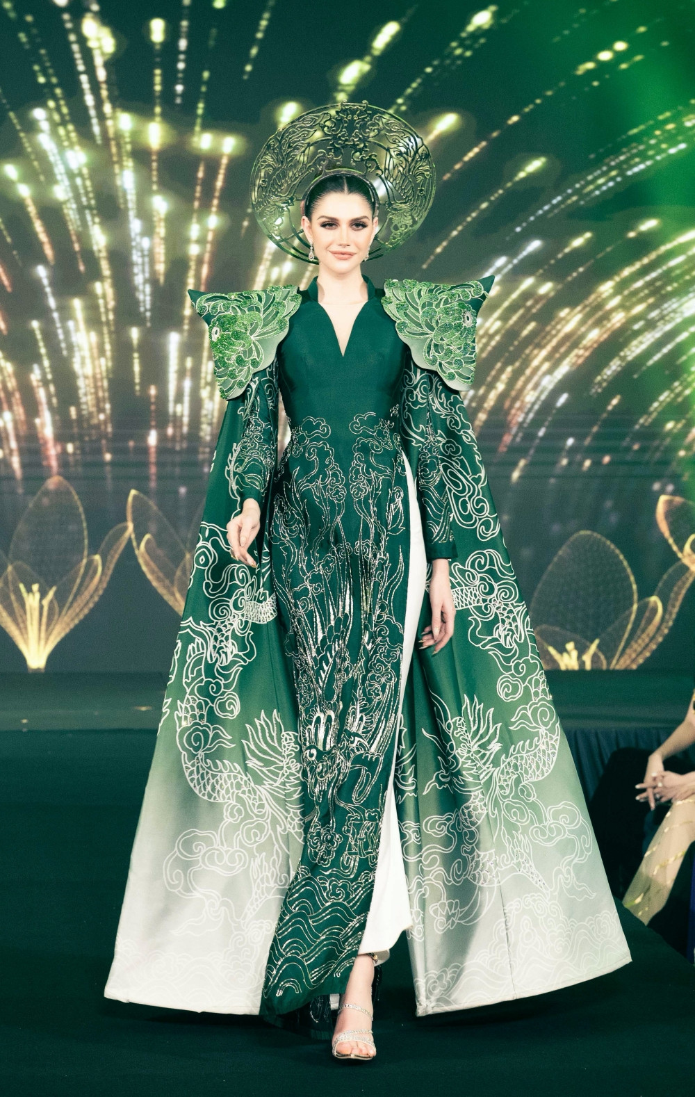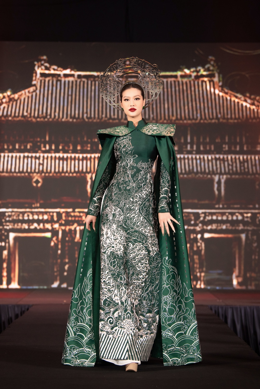 Cũng trong show diễn này, Miss Grand Vietnam 2022 Đoàn Thiên Ân mở màn với chiếc áo dài màu xanh, chất liệu lụa tơ tằm, gấm, nhung được thêu và đính kết tỉ mỉ.