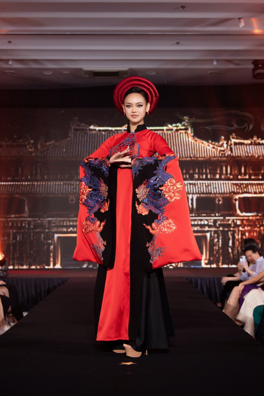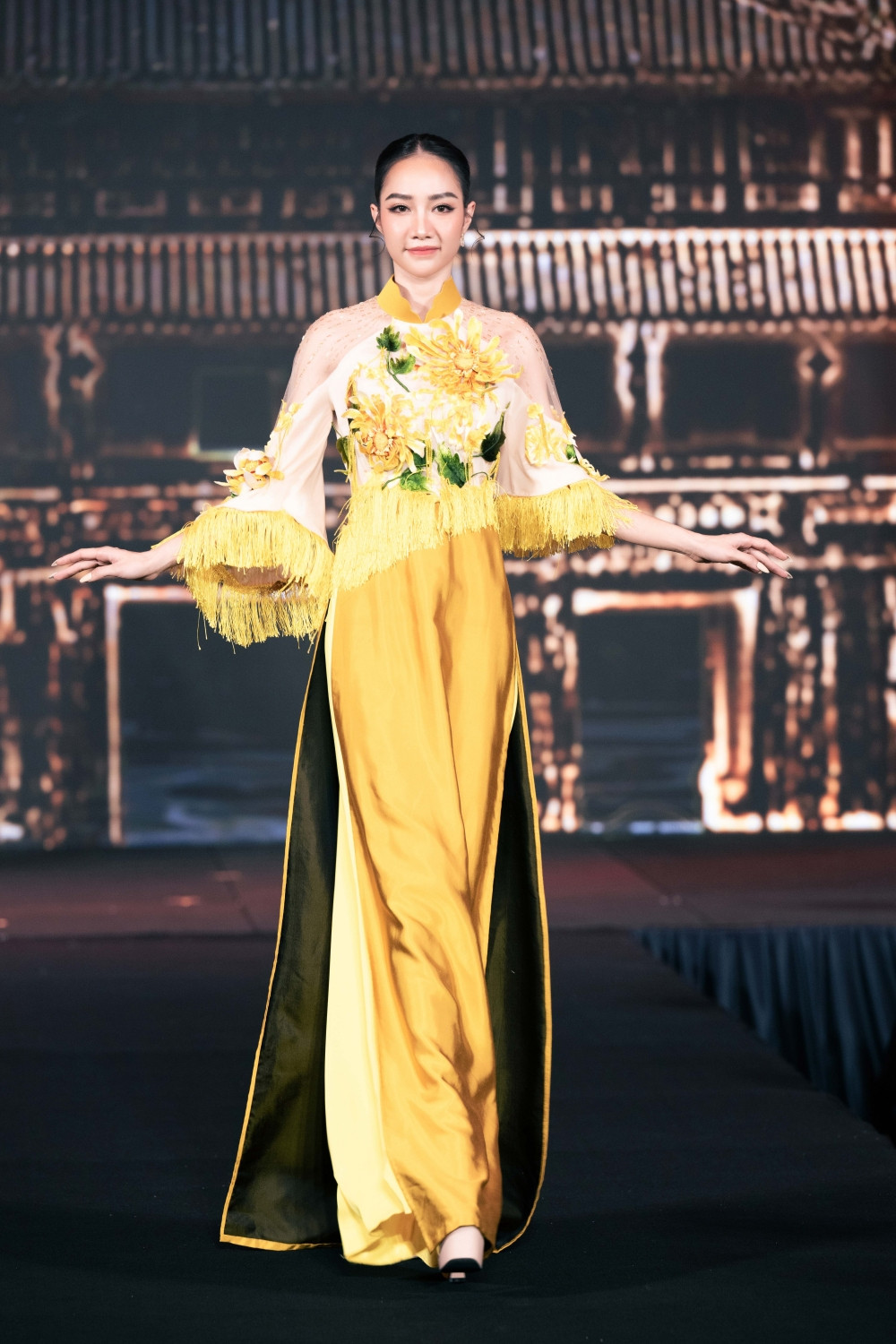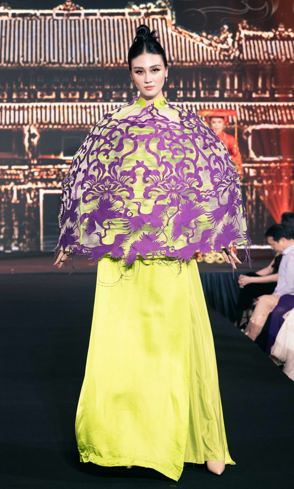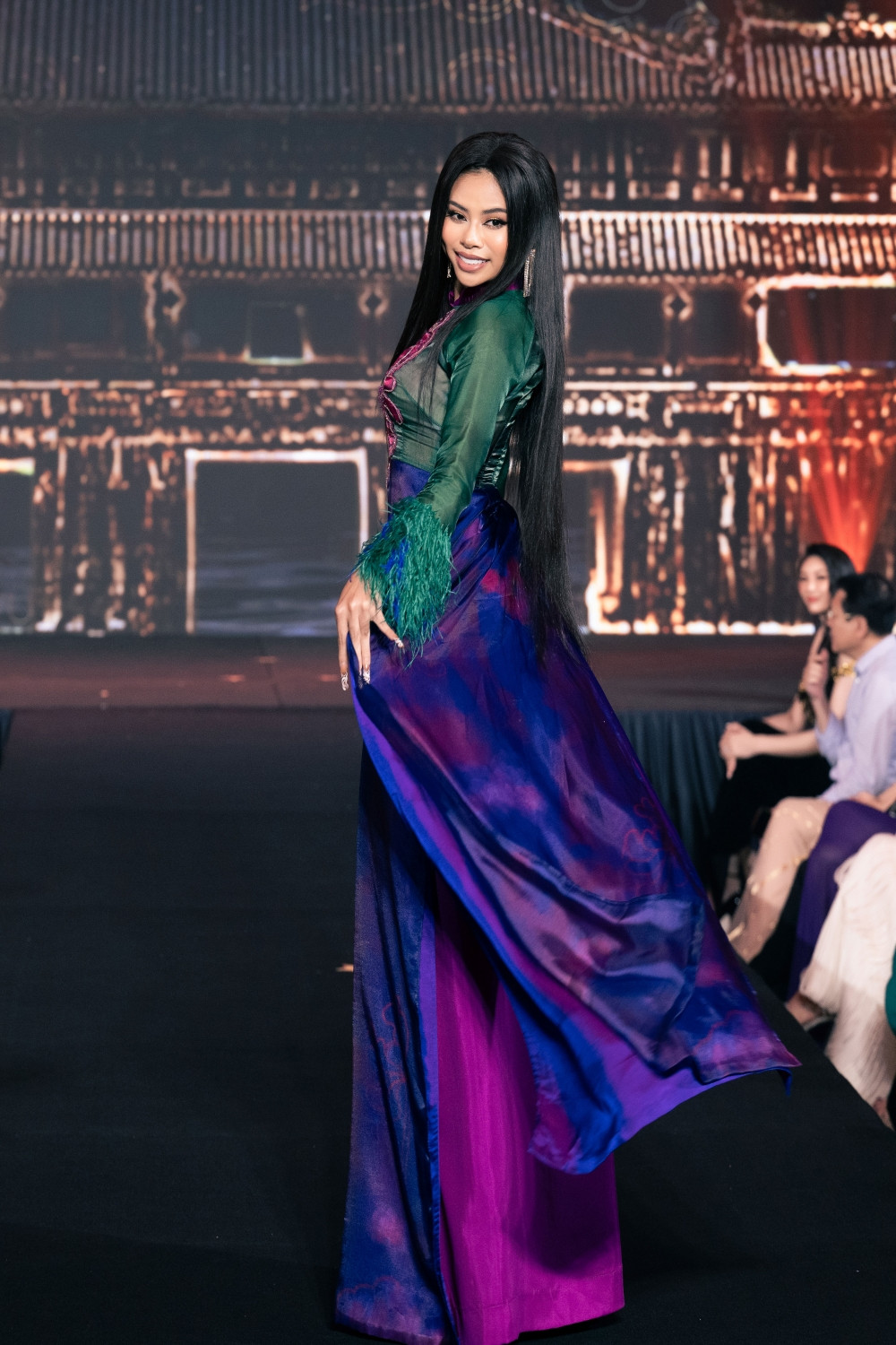 Cũng trong show diễn này, Miss Grand Vietnam 2022 Đoàn Thiên Ân mở màn với chiếc áo dài màu xanh, chất liệu lụa tơ tằm, gấm, nhung được thêu và đính kết tỉ mỉ.